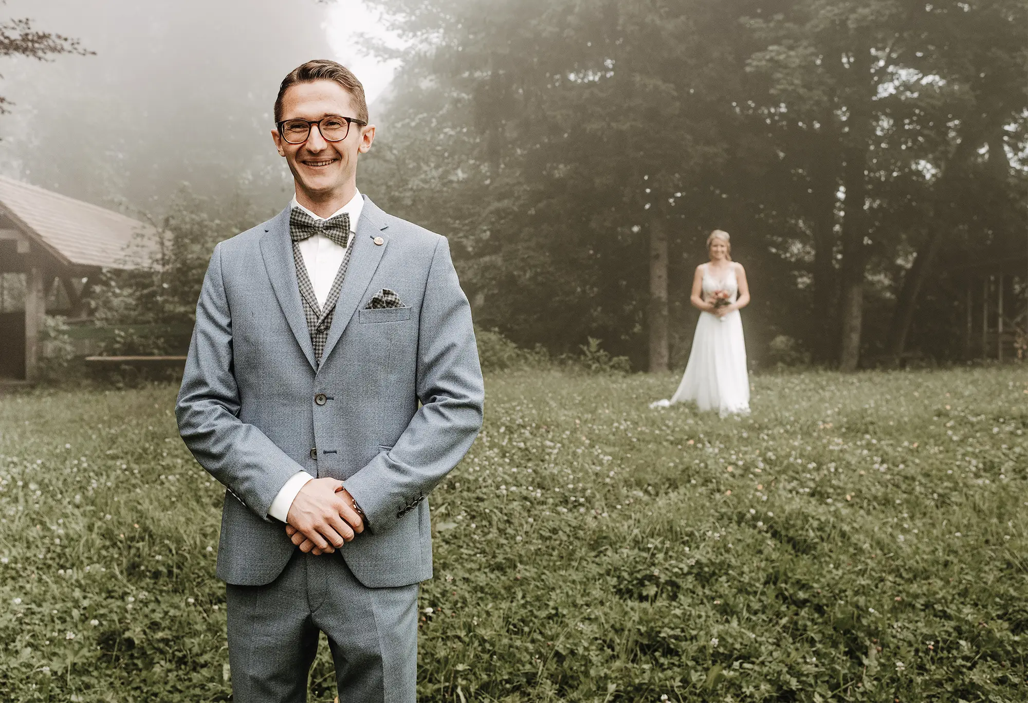 Der Bräutigam trifft gemeinsam mit seinem Trauzeugen am vereinbarten Treffpunkt ein. Man spürt Vorfreude, Aufregung, dieses leise Kribbeln vor einem der wichtigsten Momente des Tages. Die Fotografin begrüsst die beiden und erklärt, wie alles ablaufen wird, sodass die Nervosität langsam der Vorfreude weicht.