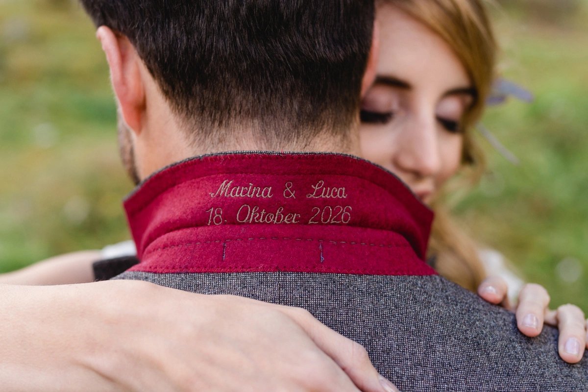 Ein besonderes Detail von nisago-Hochzeitsanzügen ist die beliebte Kragenstickerei mit den Namen und dem Hochzeitsdatum des Paares. Auch hier kann die Filz- und Fadenfarbe frei gewählt werden. All diese kleinen, individuell gesetzten Akzente verwandeln deinen Massanzug in ein einzigartiges Gesamtkunstwerk, das Perfektion ausstrahlt.